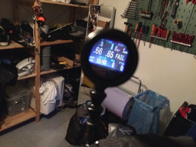 Das Ganze besteht aus einem „Tank“ in dem neben dem Akku auch die Steuerelektronik verbaut ist. Unten auf dem Bild ist das HeadUp Display. Ist alles gut, blinkt eine grüne LED. Steigt der co2 Anteil an, Leuchtet dir grüne konstant – dann kommt eine Gelbe hinzu. Erscheint dann dazu noch die Rote ist es Zeit, aus dem Loop auszusteigen. Alternativ zu diesem LED Kino gibt es inzwischen auch kleine Rechner, welche genau den co2 Wert anzeigen. Ich finde diese Lösung aber schöner.