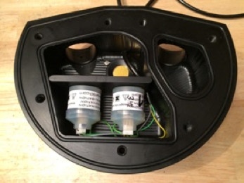 Der neue Kopf ist fertig. Es hat jetzt 3 Kabelaushänge; einen zum Controller, einem zum Backup (Shearwater Nerd) und einem zum co2 HUD. auf dem Bild links ist der co2 Sensor vor dem Einbau zu sehen, rechts (der gelbe Punkt üner den o2 Sensoren) ist im eingebautem Zustand – natürlich auf der Einatemseite!