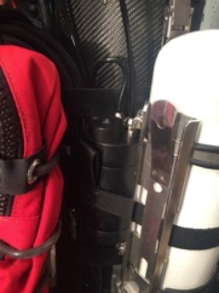 Unlen links ist der Akkutank mit der Elektronik und dem Schalter zu sehen. Ich habe ihn mit einem Bungee Band an der Diluentflasche befestigt. So ist er schnell ausgebaut. Nicht 100% ideal… Irgendwann baue ich da eine Halterung an die Carbon Röhre… Aber die Positionierung ist gut. Er verschwindet hinter der Arbonflasche, wenn ich diese an die Diluentflasche anklippe.